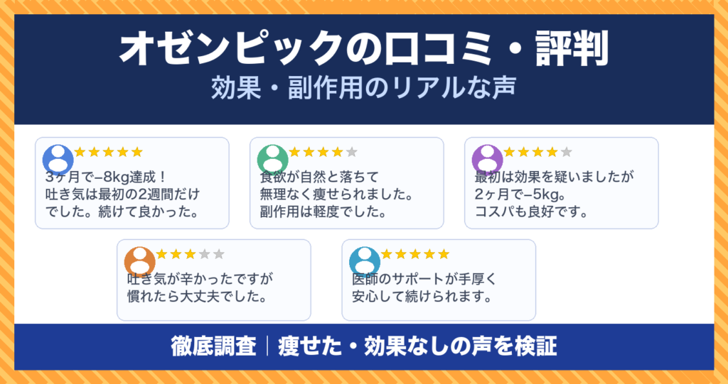 オゼンピックの口コミ・評判をSNS・体験者の声から徹底調査しました。吐き気などの副作用の実態、何キロ痩せたかのリアルな数字、SUSTAIN試験データ、処方クリニック3社の料金比較まで2026年最新情報を詳しく解説します。 -
